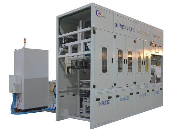 該設備為自動防銹烘干機,采用高壓熱風循環干燥+霧化噴淋工藝,整機采用多臂機械手傳動機構,PLC+ 觸摸屏控制。該設備共4個工位:上料工位、高壓熱風烘干工位、霧 化噴淋防銹工位、下料 工位。該設備還包含循環過濾裝置等。該機結構設計及工藝安排合理、自動化程度高、上油精度高, 有效解決了此類工件的上油難題.