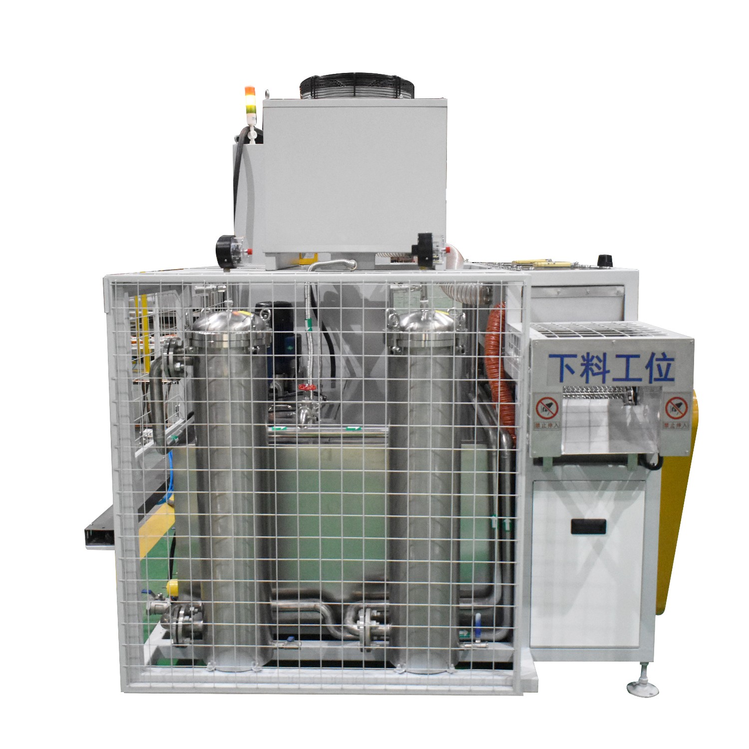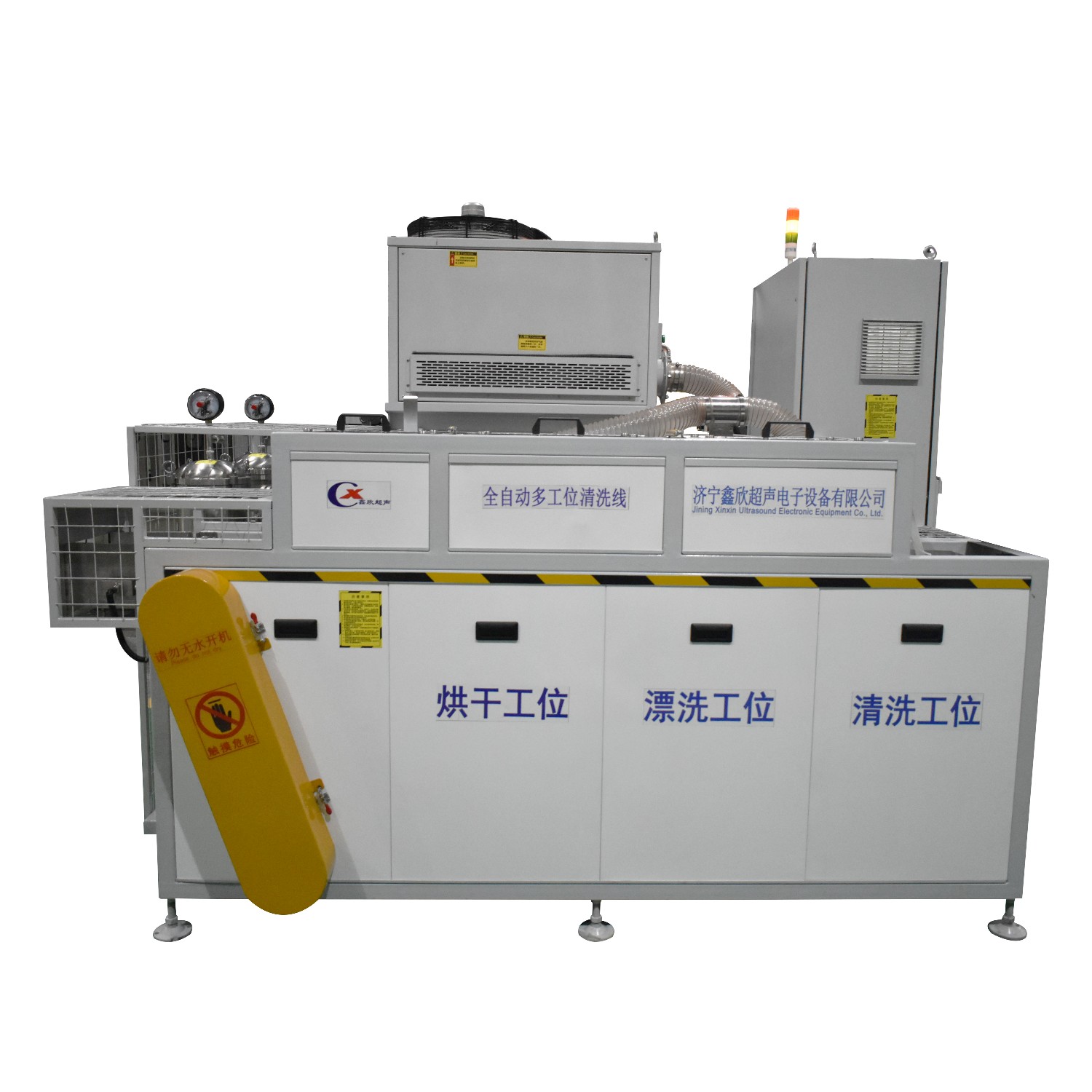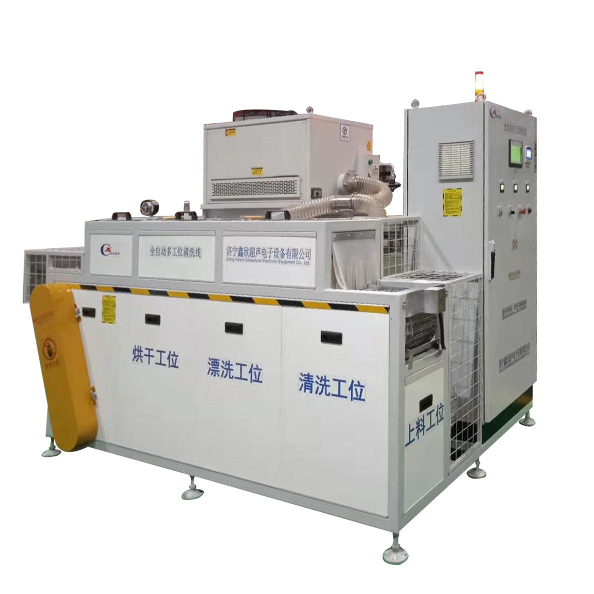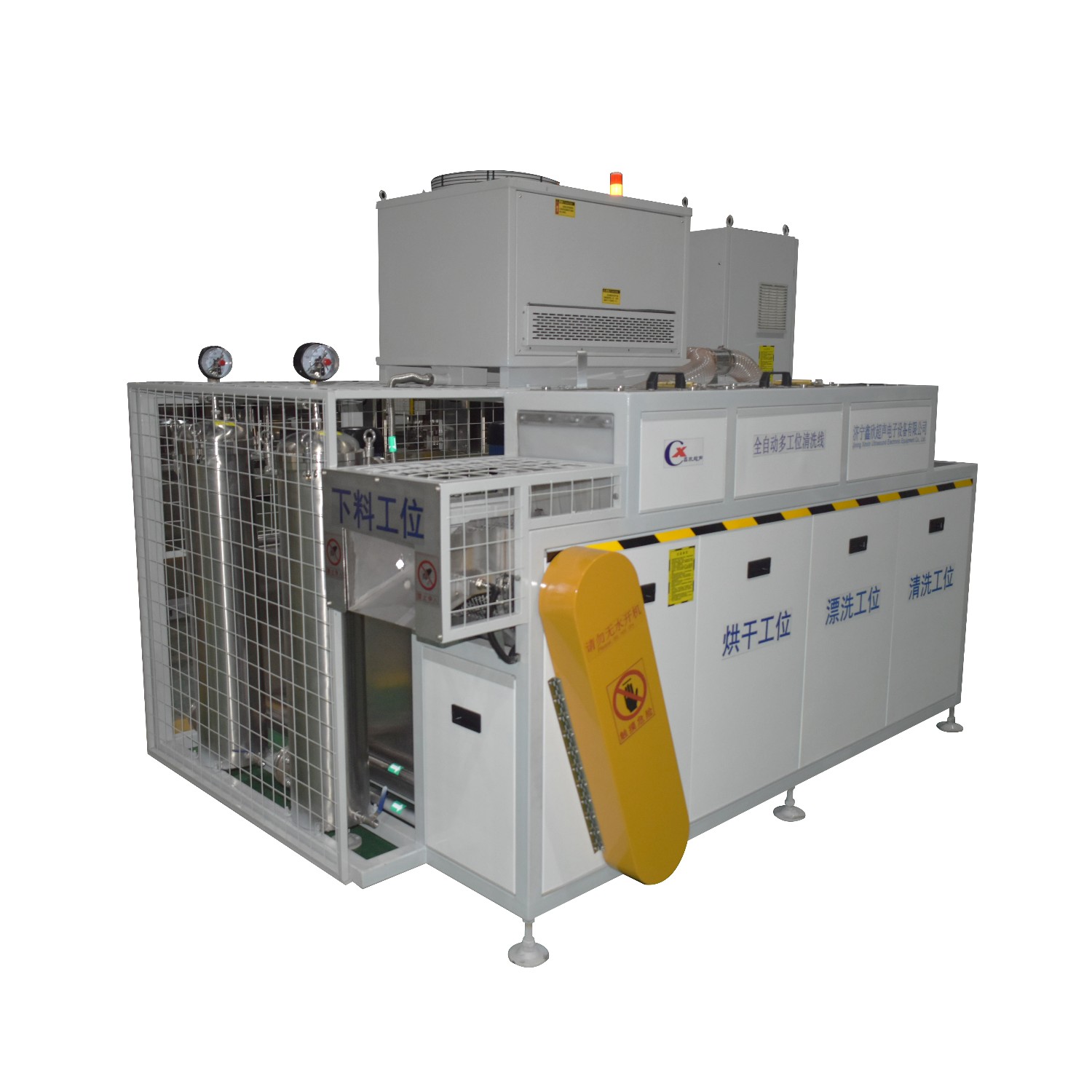 該設備為全自動高潔凈度清洗機,整機為網帶鏈條式傳動機構。采用高壓噴淋粗洗、高壓噴淋精洗、高壓風切切水等工藝。該設備共5個工位:上料工位、高壓噴淋粗洗工位、高壓噴淋精洗工位、風dao切水工位、下料工位。該設備清洗效果好、提高了工件的清潔度。該機結構設計及工藝安排合理、自動化程度高、清洗精度高,有效解決了此類工件的清洗難題。